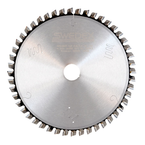 A fine tooth blade with negative rake angle (teeth lean slightly backwards) and triple chip grinding suitable for aluminium and other non-ferrous metals. Also suitable for hard plastics. Tooth pitch of 13mm suitable for sections with wall thickness 3-15mm and small solids up to 50mm. These blades are ideal for single and double mitre saws, chop saws, saw benches, panel saws and many other machines. Negative rake angle is a good choice for manual (hand) feed saws as it is less likely to "grab" into the material. Choose positive rake angle for automatic feed and clamping of the material and for thick sections (10mm+wall) and solid material.